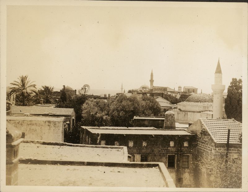 : "Rhodes. View over house tops to minarets"