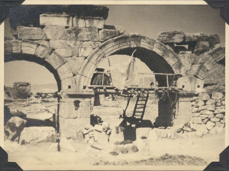 Description: ""Native housekeeping in the ruins of the old Aqueduct. Cradle swinging froam rafters, peppers festooned from ""second floor""!", "On cardboard with title ""HIERAPOLIS""""
