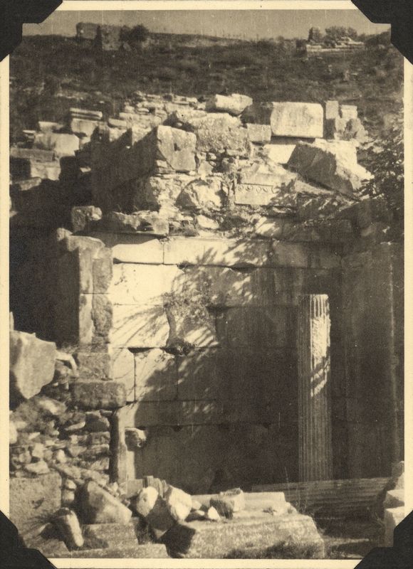 : "Fountain at foot of stage Bldg. Main E-W street, "On cardboard with title ""PRIENE Sept. 1938""""