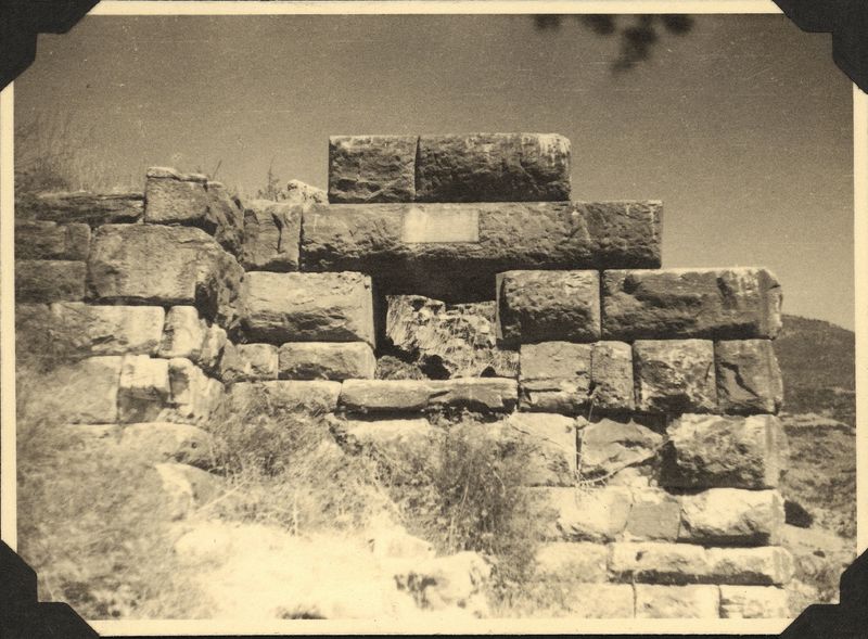 : "City gate with inscriptions giving date, of founding?, "On cardboard with title ""PRIENE"".""