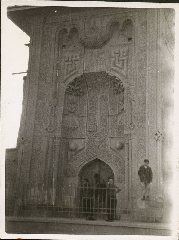 : "Indsche Minareti Djami built 1251, black & blue faience tile., "On cardboard with title ""KONYA Fall - 1938"".""