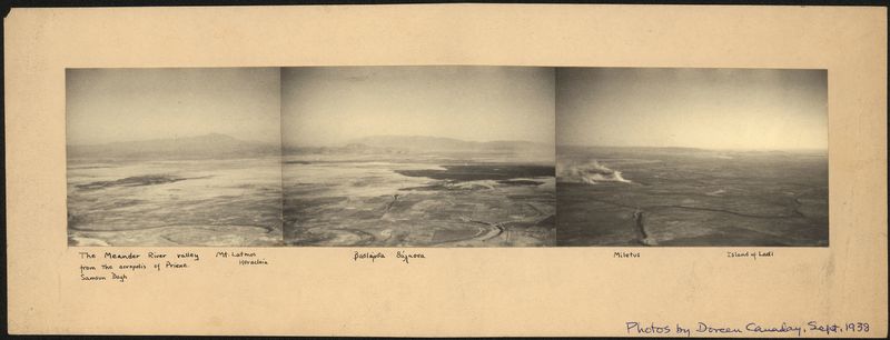 Description: "The Meander River valley from the acropolis of Priene. Samsun Dagh. Mt Latmos Heracleia. Βασταρδα θαλασσα. Miletus. Island of Ladi., "On cardboard with title ""photos by Doreen Canaday, Sept. 1938"".""