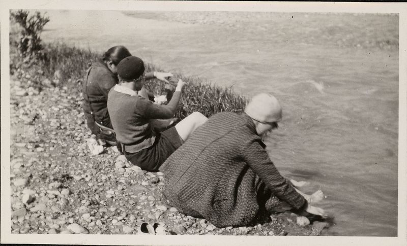 : "Preparing to cross stream near Haghia Triada 1937 DCS r. to I. Verna Broneer Mary Campbell (Roebuck) M. Hill (Wittmann, Written on back"