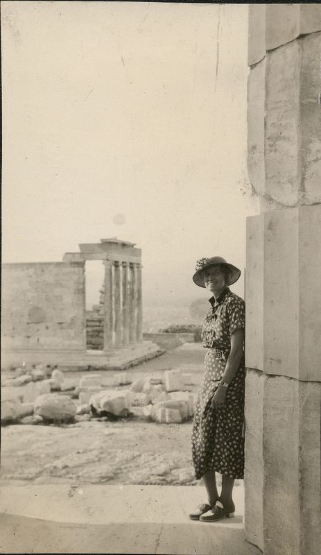 : "Woman by a column at the Acropolis"