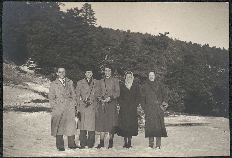 : "Parnes- December 1937 Saul Weinberg Larry Angel Peggy Angel Mary Campbell Miggy Hill, Written on back"