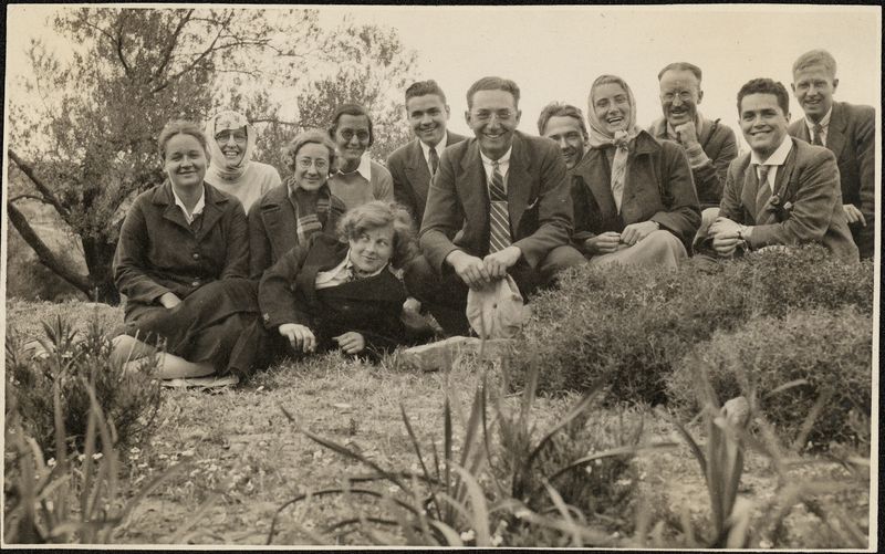 Description: """"The Oxford Movement"" 1937 M. Hill (Wittmann) Peggy MacVeagh (Thorne) Mary Campbell (Roebuck) Dorothy Schierer Elvis Starr (Oxford) Saul Weinberg Fred Householder Doreen Canaday (Spitzer) Mr. Willoughby Claude Labrecque (Oxford) Francis C. Evans (Oxford) ", Written on back"