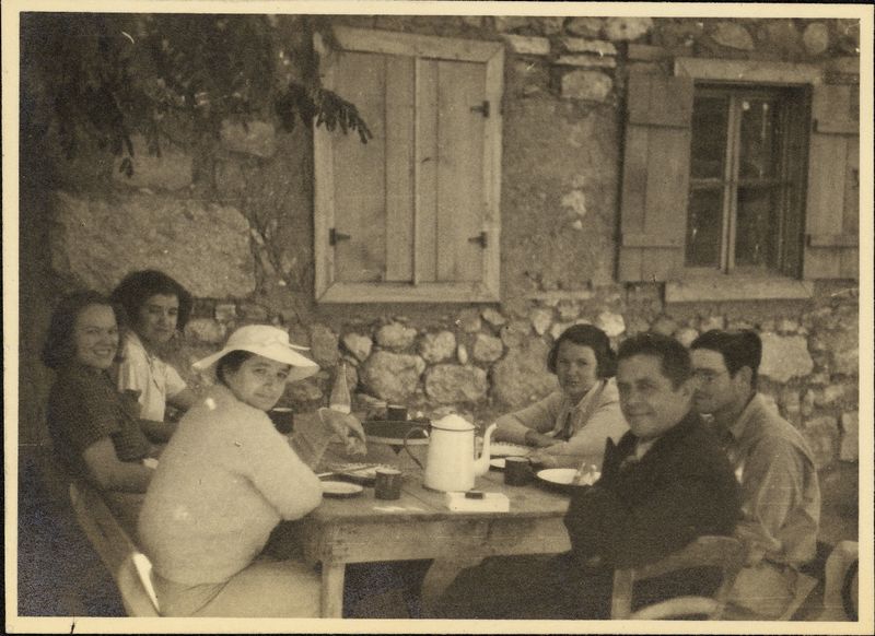 Description: "1938 Breakfast at Tarsus - Miss Goldman's excavation. Fran Jones, Flossie Day, Hetty Goldman, Anne Ehrich, The Inspector, Bob Ehrich, Written on back"