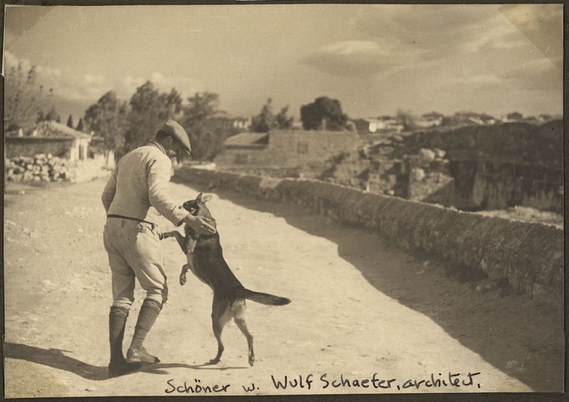: "Corinth. Wulf Schaefer, architect with his dog Schoner"