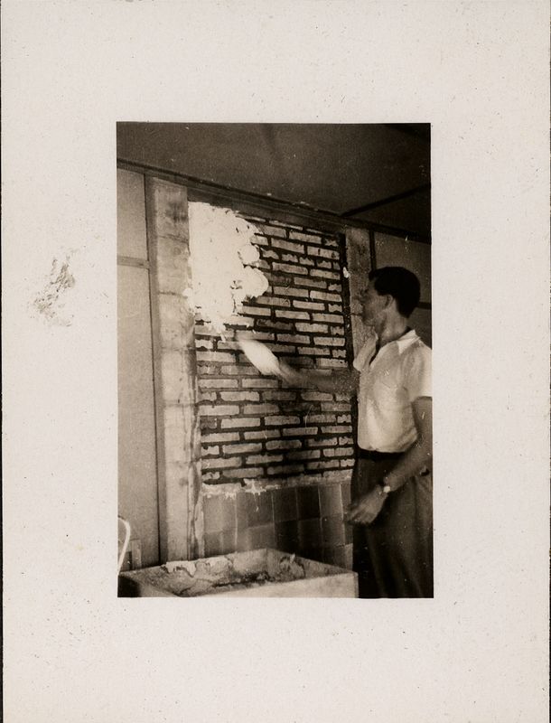 : "C.H. Morgan II builds fireplace in Director's suite, Annex to Oakley House 1937, On cardboard"